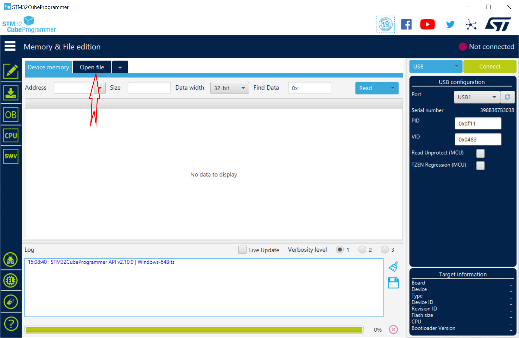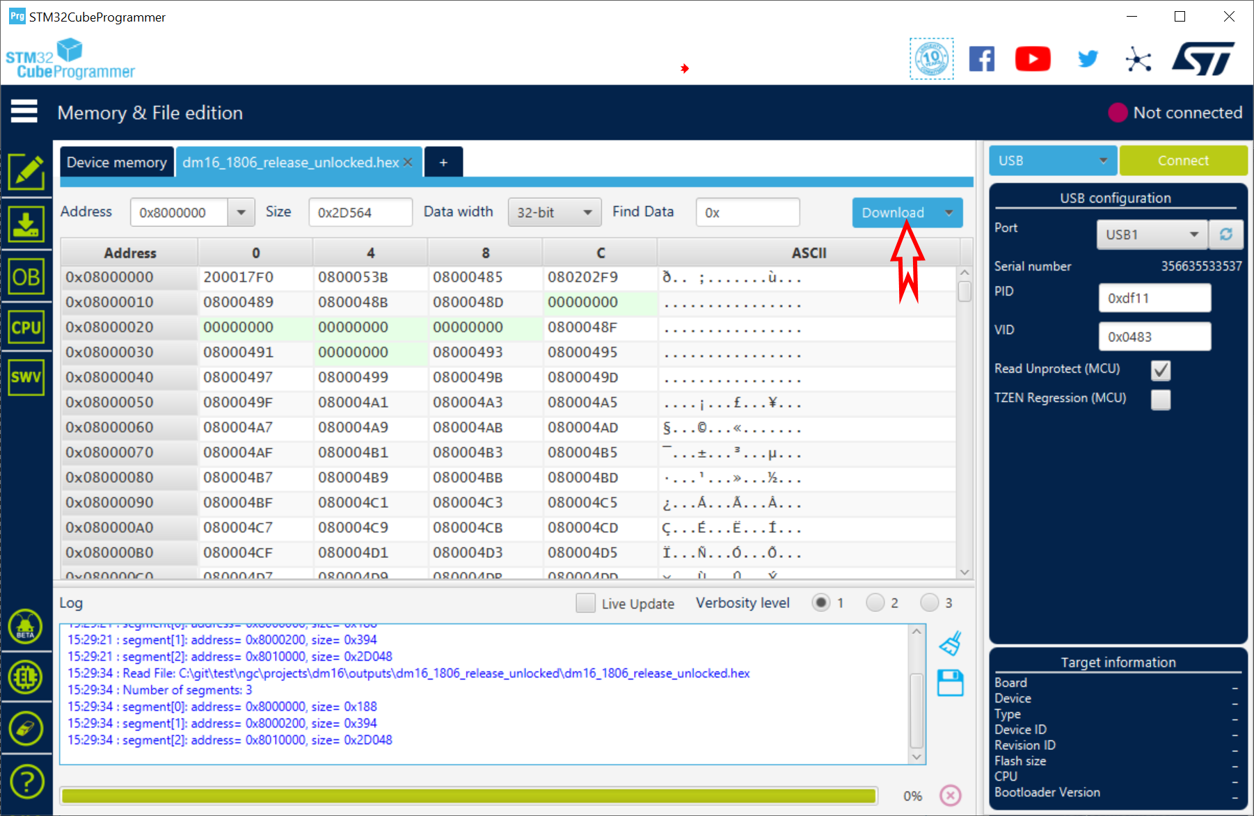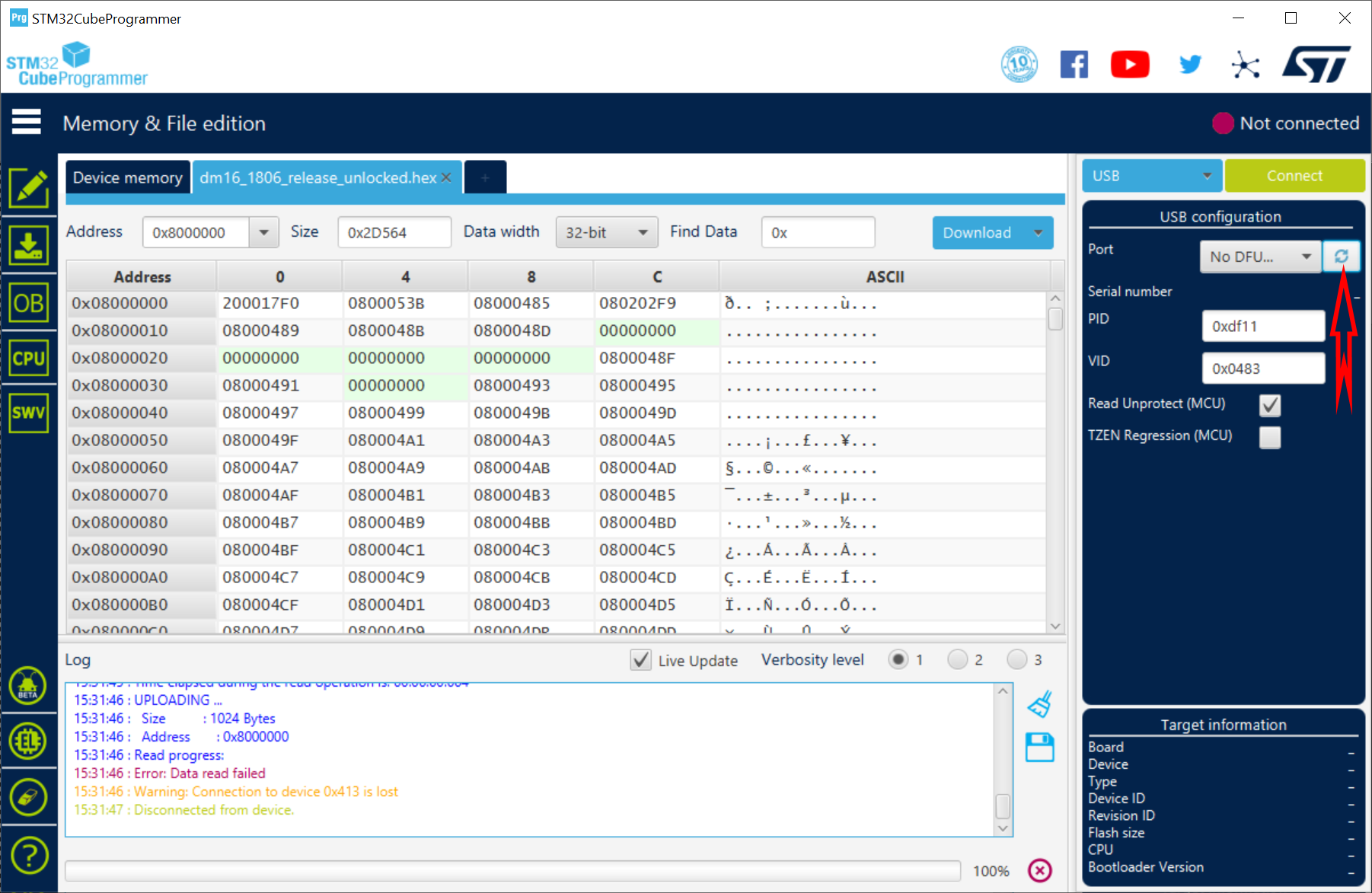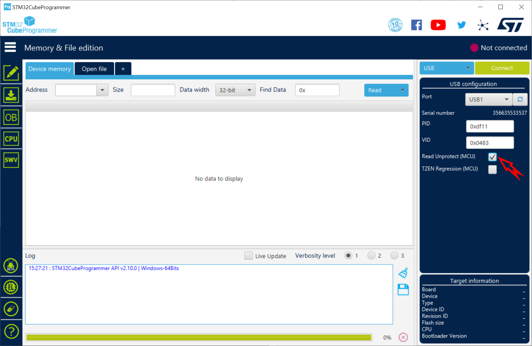 - Click the "Read Unprotect (MCU)" checkbox. (This step is optional if the firmware is already an "unprotected" version.)