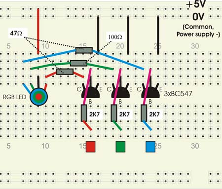 - You may have noticed I used 100Ω for green but 47Ω for red and blue current limiting resistors. The reason is that in all the RGB LEDs I checked out, the green output is about twice the other two colours at the same current.