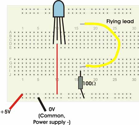 Caution: Be very careful that the wire with +5V on it touches nowhere but the terminals marked with coloured squares. Anywhere else could result in excessive smoke emissions and component failure.
