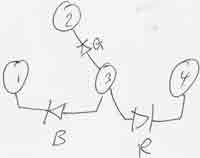 Study the breadboard layout above. Assuming I have correctly connected the common anode pin to +5V via the red wires, then touching each of the other pins with the yellow flying lead should light up one of the LEDs and identify the colour for that pin. Try it yourself! If you don't get the expected result, try a different pin as the common. I did this work with a sample LED from a supplier, which came with an ambiguous pre-release data sheet. In the end I was getting confused and wound up drawing this diagram: