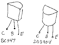 The transistor pins, Base, Collector and Emitter. Different transistors have different pin placements - the manufacturers like to keep us on our toes! Here are the pinouts for the two types I have suggested. You can see that one is a complete 180° rotation of the other!