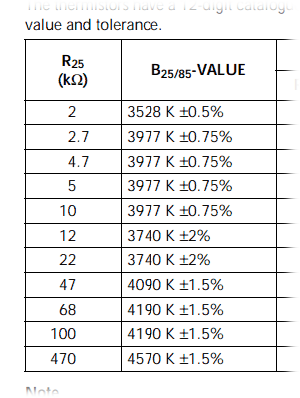 If you were for example using the 5th thermistor from the top in this data sheet, you would have