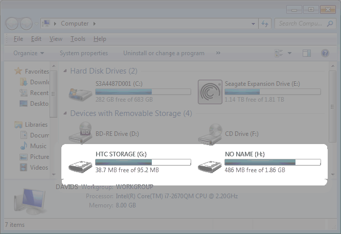 This 'phone actually appears in My Computer as two "drives" when "mounted as a disk drive". The lefthand one in the image below is the phone's internal storage. The one we want is the righthand one, which represents a plugged in SD card.